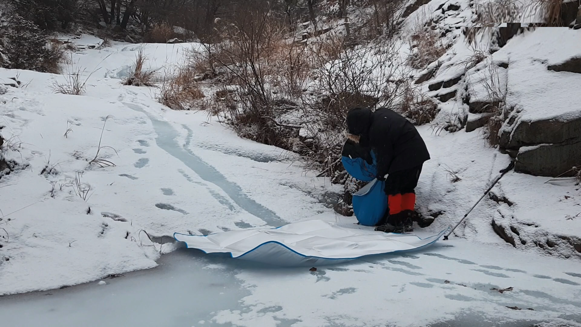 계곡물 얼음 위에 돗자리를 깔고
