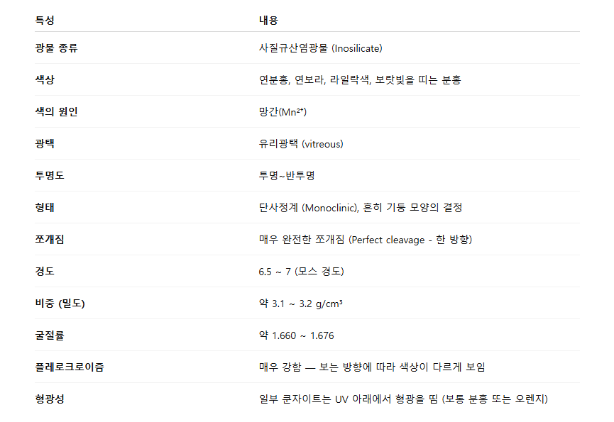 - 쿤자이트 스포듀민(Kunzite Spodumen) 주요 특성 및 성질