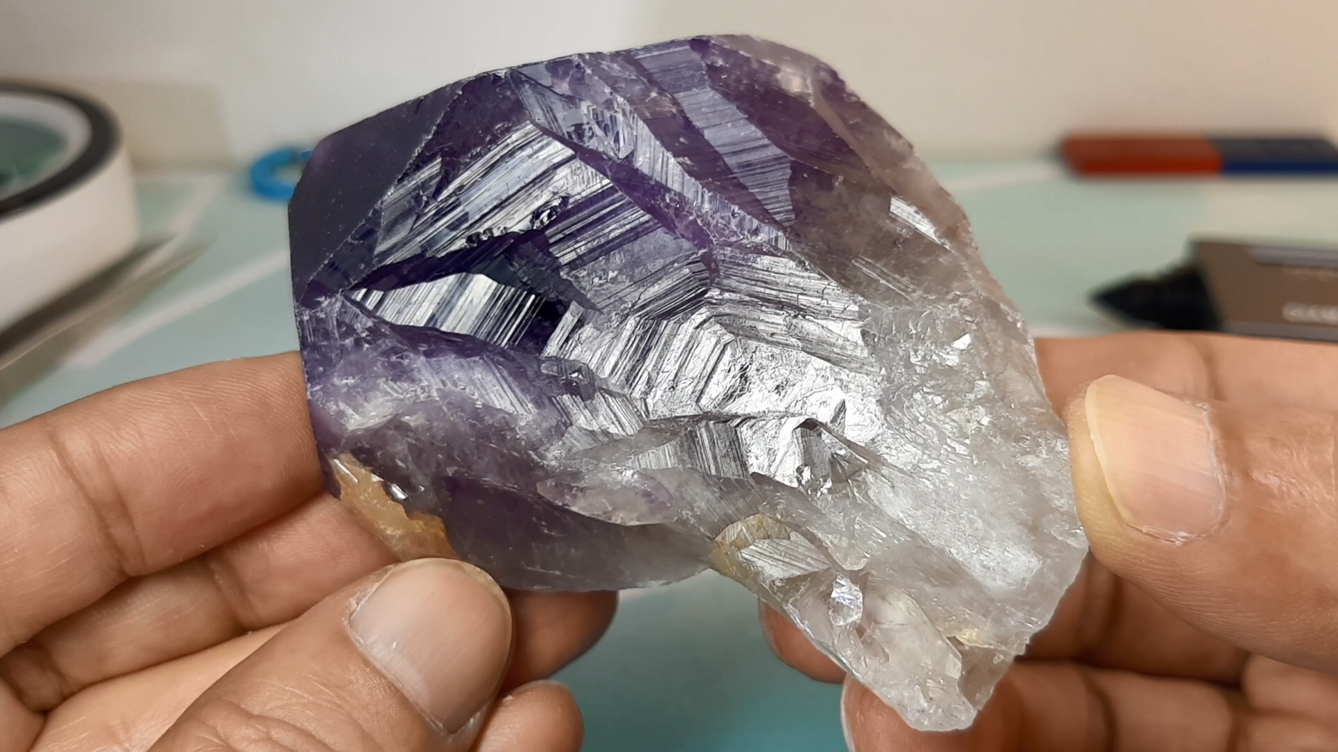 자수정의 색은 주로 철(Fe)의 미량 성분에 의해 영향을 받습니다.