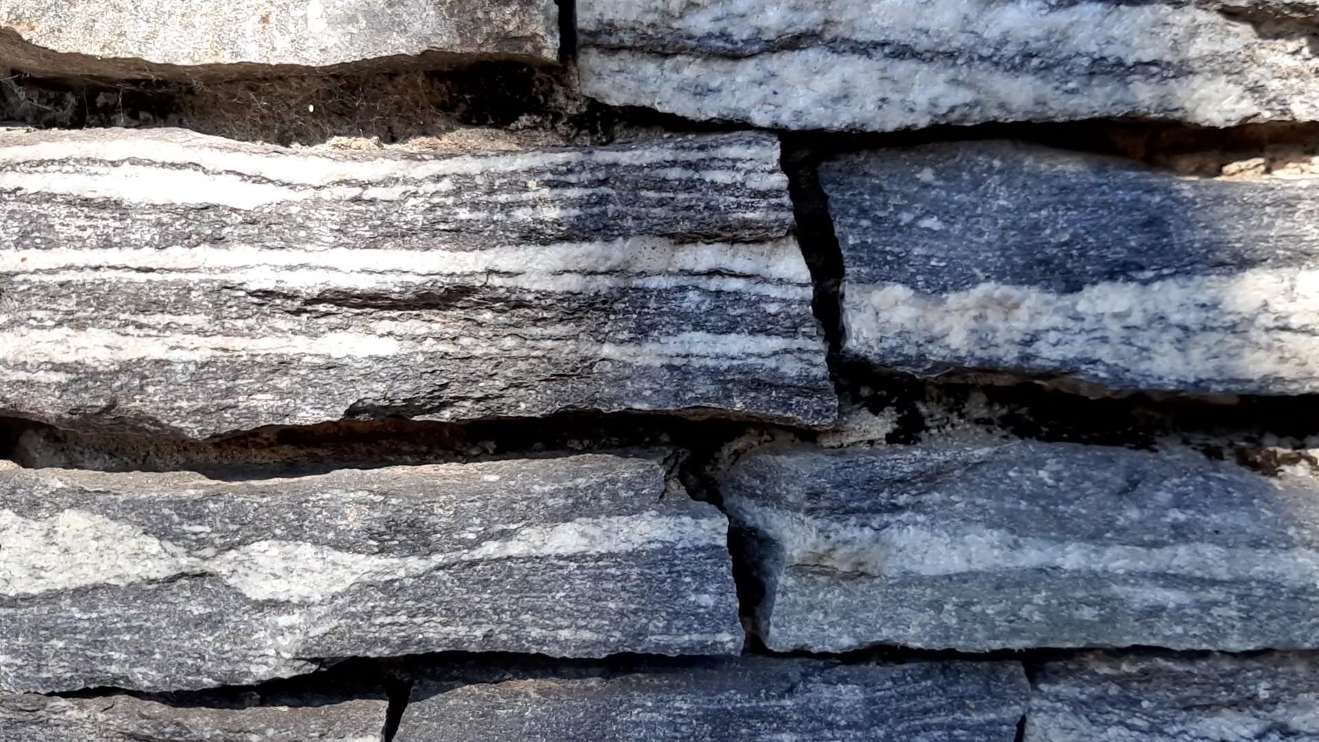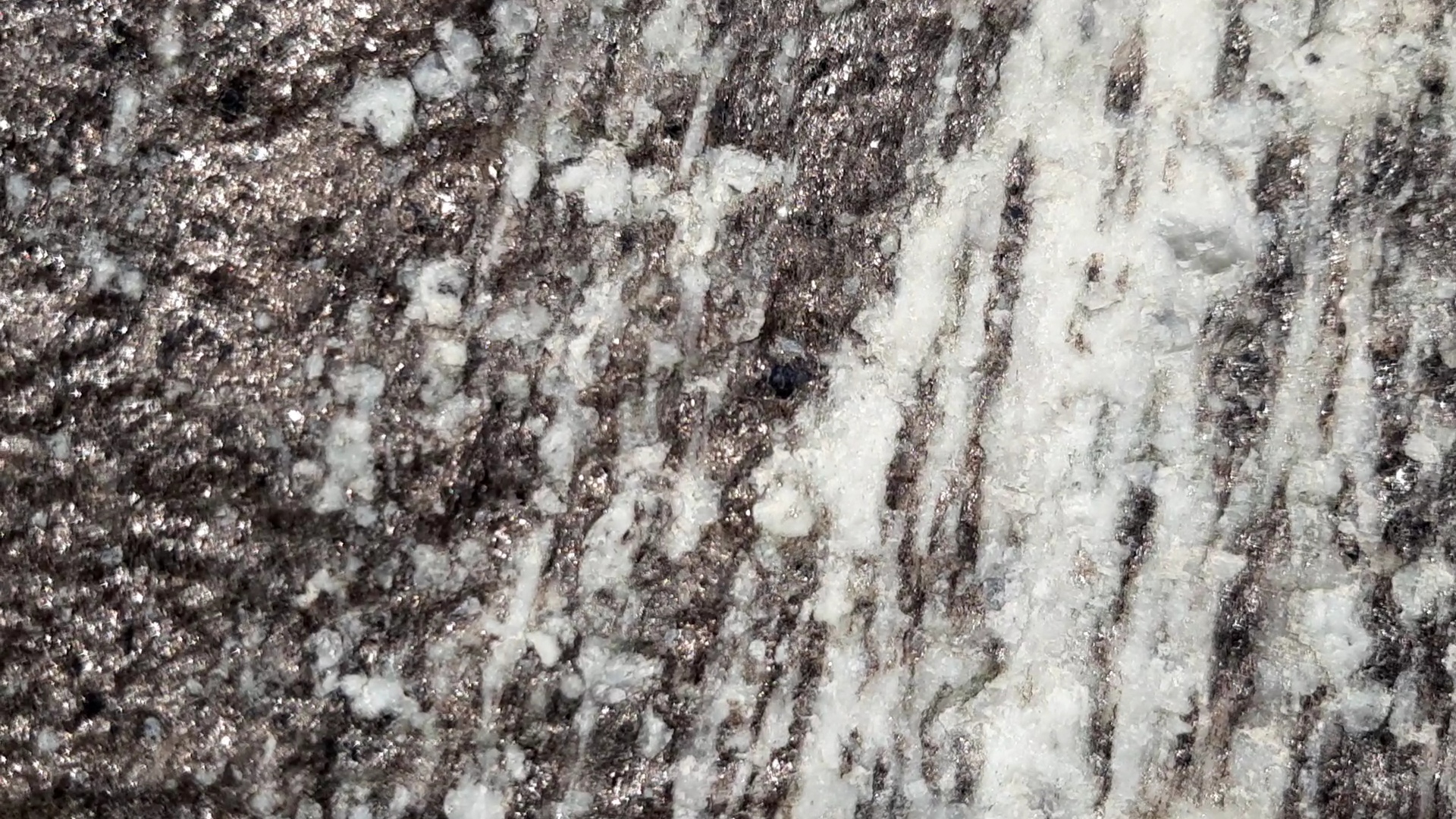 어두운 색의 흑운모, 밝은 색의 석영 및 장석이 띠를 이루며 교호하는