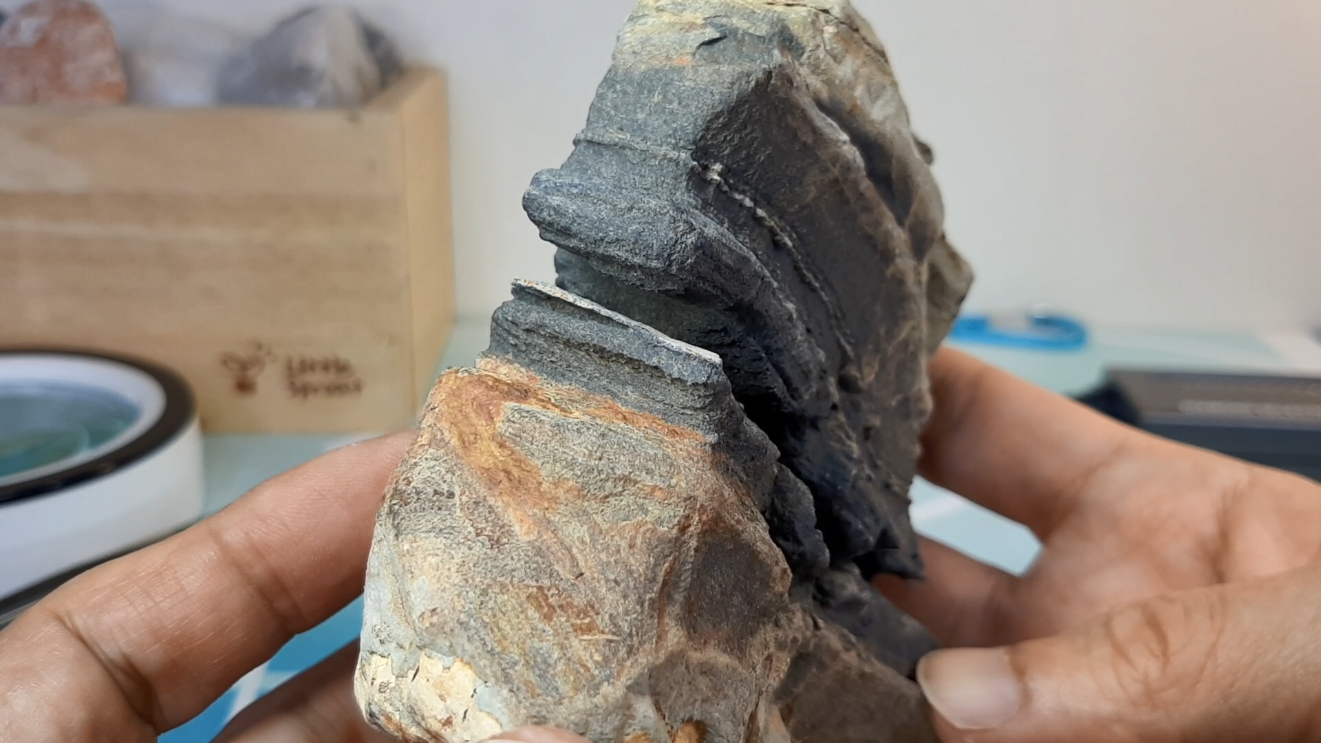 수많은 얇은 판이 겹겹이 쌓인 암석이라는 뜻.