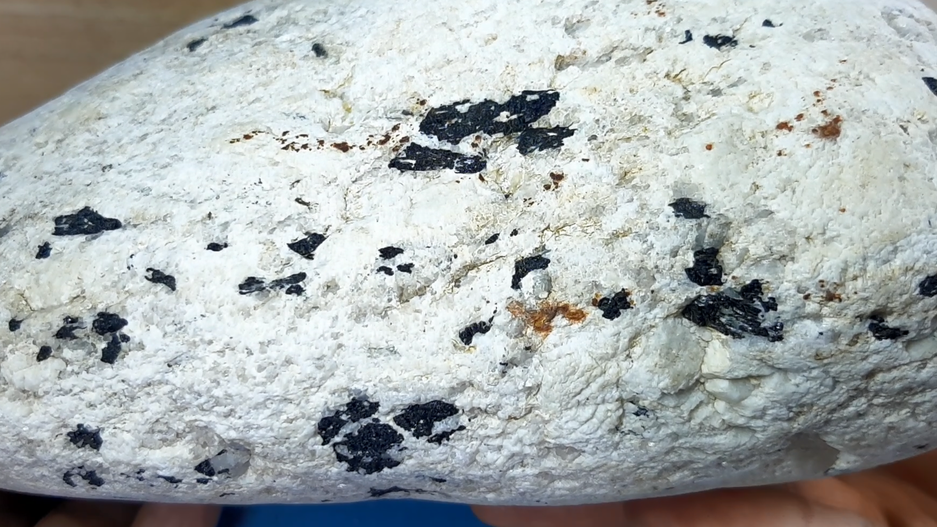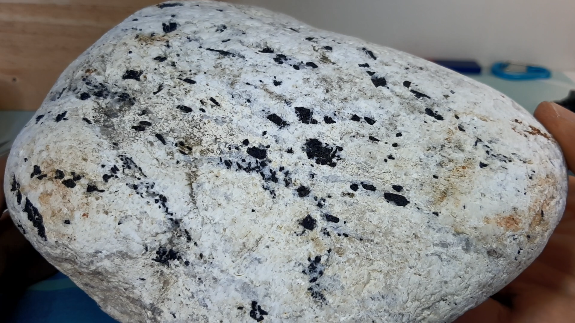 소개하는 표본은 하얀 백운모 모암에 크고 작은 전기석 결정체가 무수히 형성된 희귀 암석입니다.