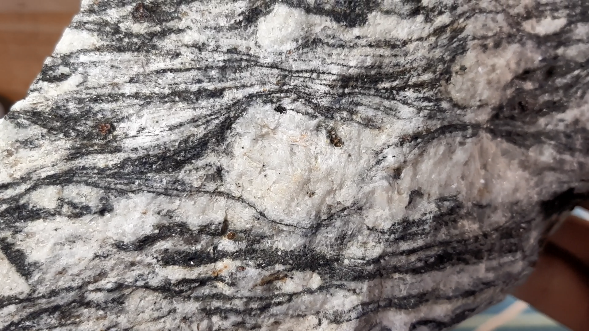 안구상 결정 주위를 둘러싸면서 ‘흐르는 듯한’ 편마 구조를 만듭니다.