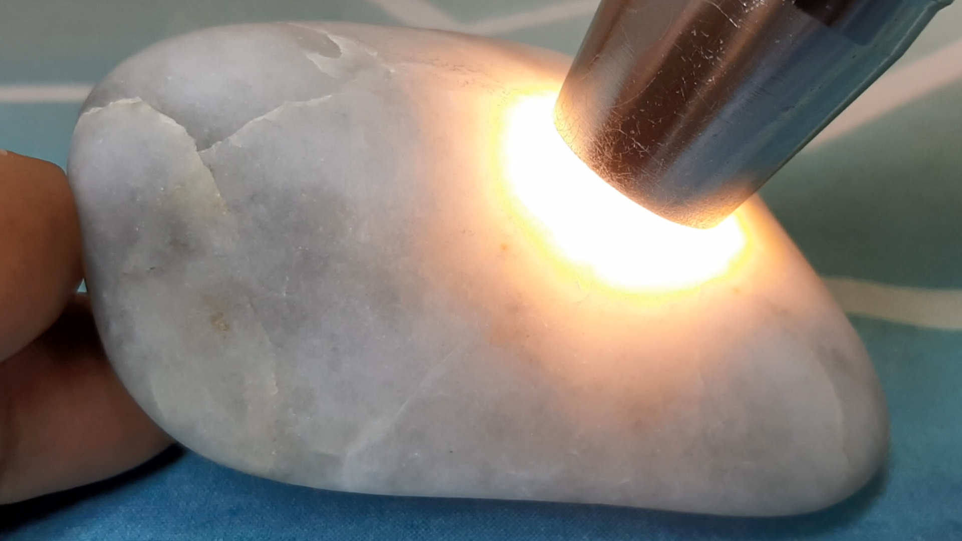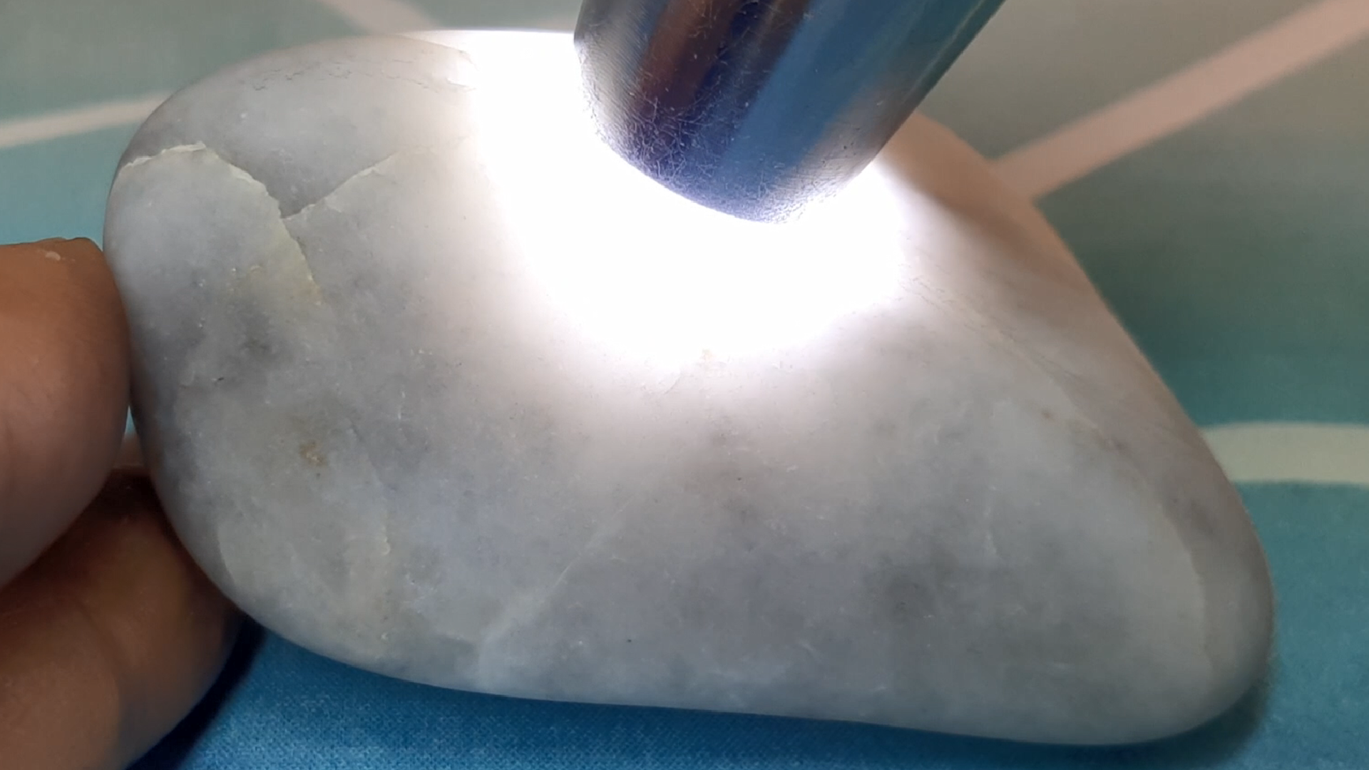 운모가 박혀있어서 희미하게 반짝이는 것이 보이는 반투명한 옥수.
