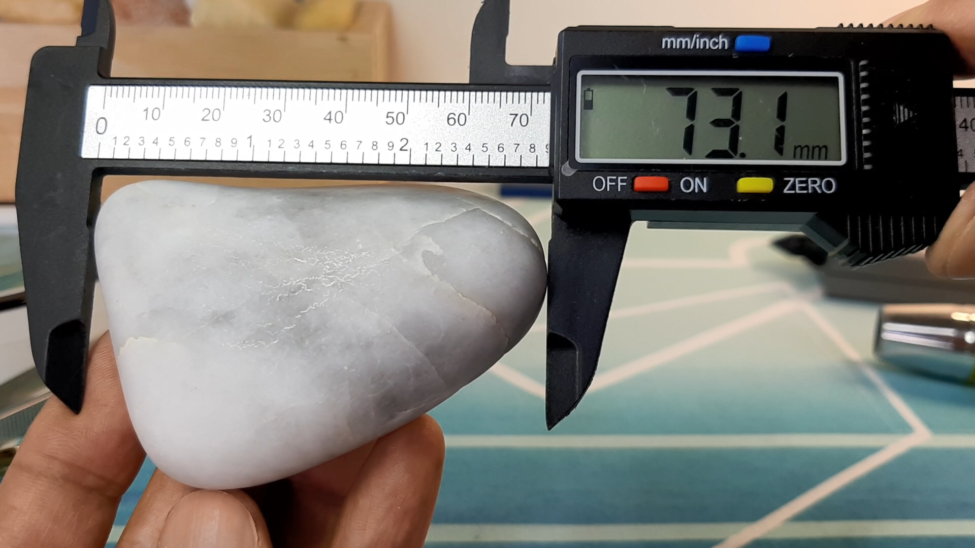 표본의 사이즈는 크기 7.3 x 5.1 x 3.0 cm, 무게 152 g (760 Carat 캐럿) 입니다.